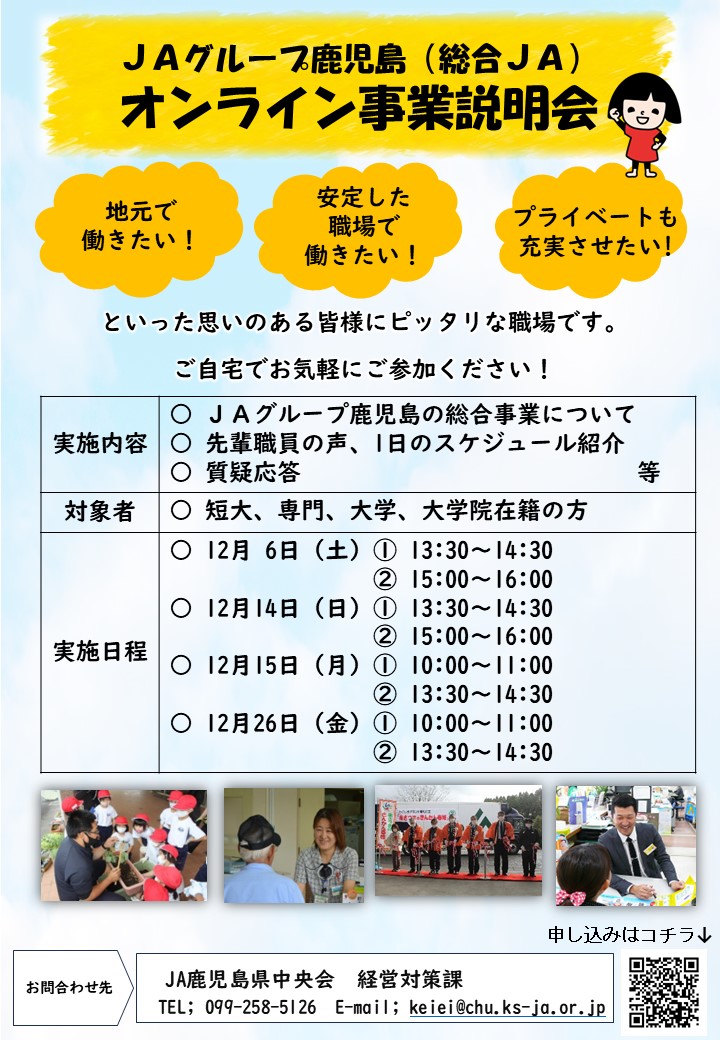 この度、下記の日程で個別事業説明会をWebにて開催します。「食や農に関わる仕事がしたい」「地元で働きたい」「鹿児島の農業に貢献したい」とお考えの学生の皆さまは、ぜひ画像右下のQRコードからエントリーしてください!ご応募をお待ちしております!